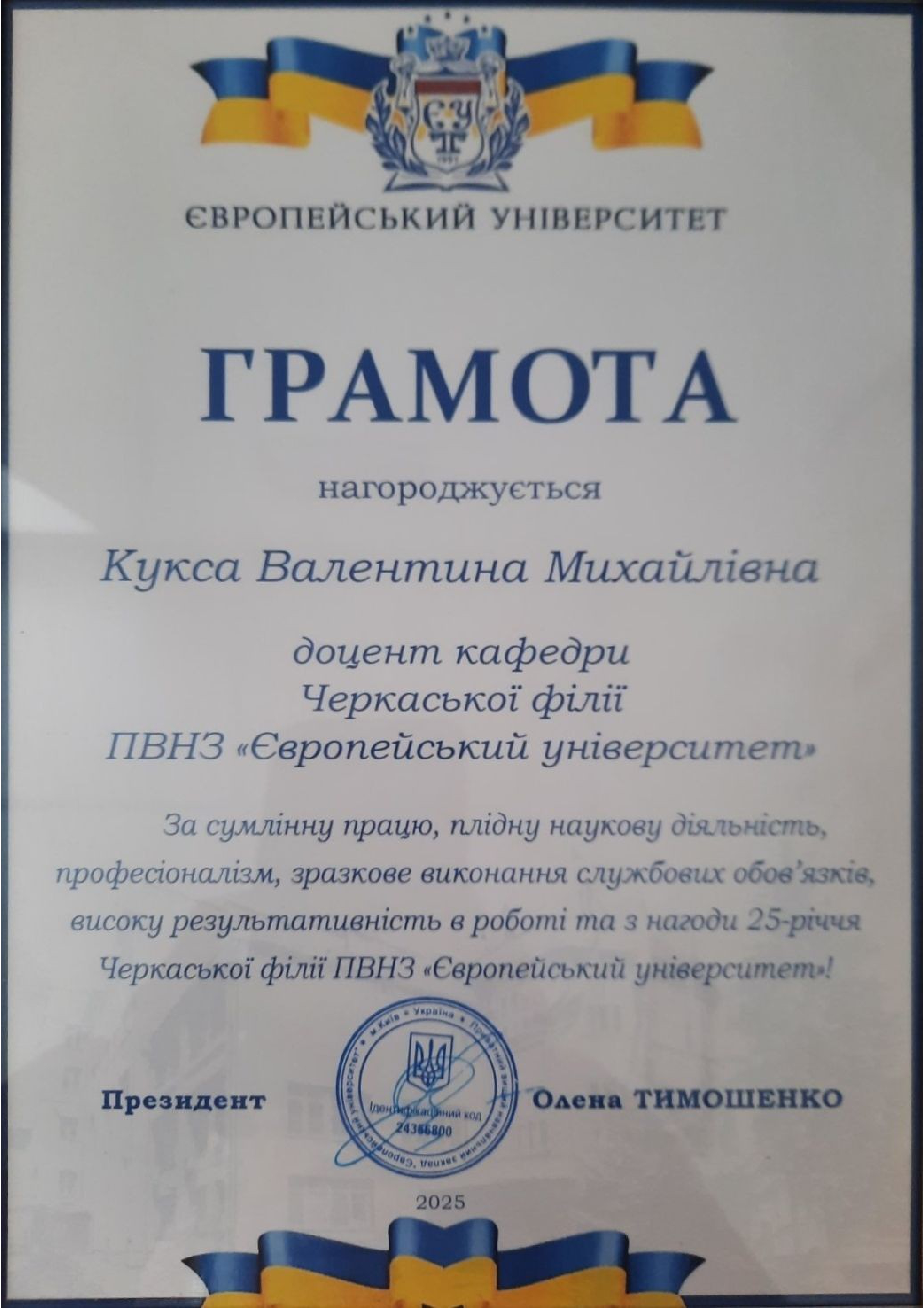 - Курс підвищення кваліфікації. WIPO-Ukraine. Women Innovators and Startup Empowerment (WISE). Program Organizerd by the World Intellectual Property Organization (WIPO) and the IP Academy of the Ukrainian National Office for Intellectual Property and Innovations (UANIPIO) with the assistance of the Korean Intellectual Property Office (KIPO) 30 год. (1 кр. ECTS). June24-July17,2025. Сертифікат від 17.07.2025.