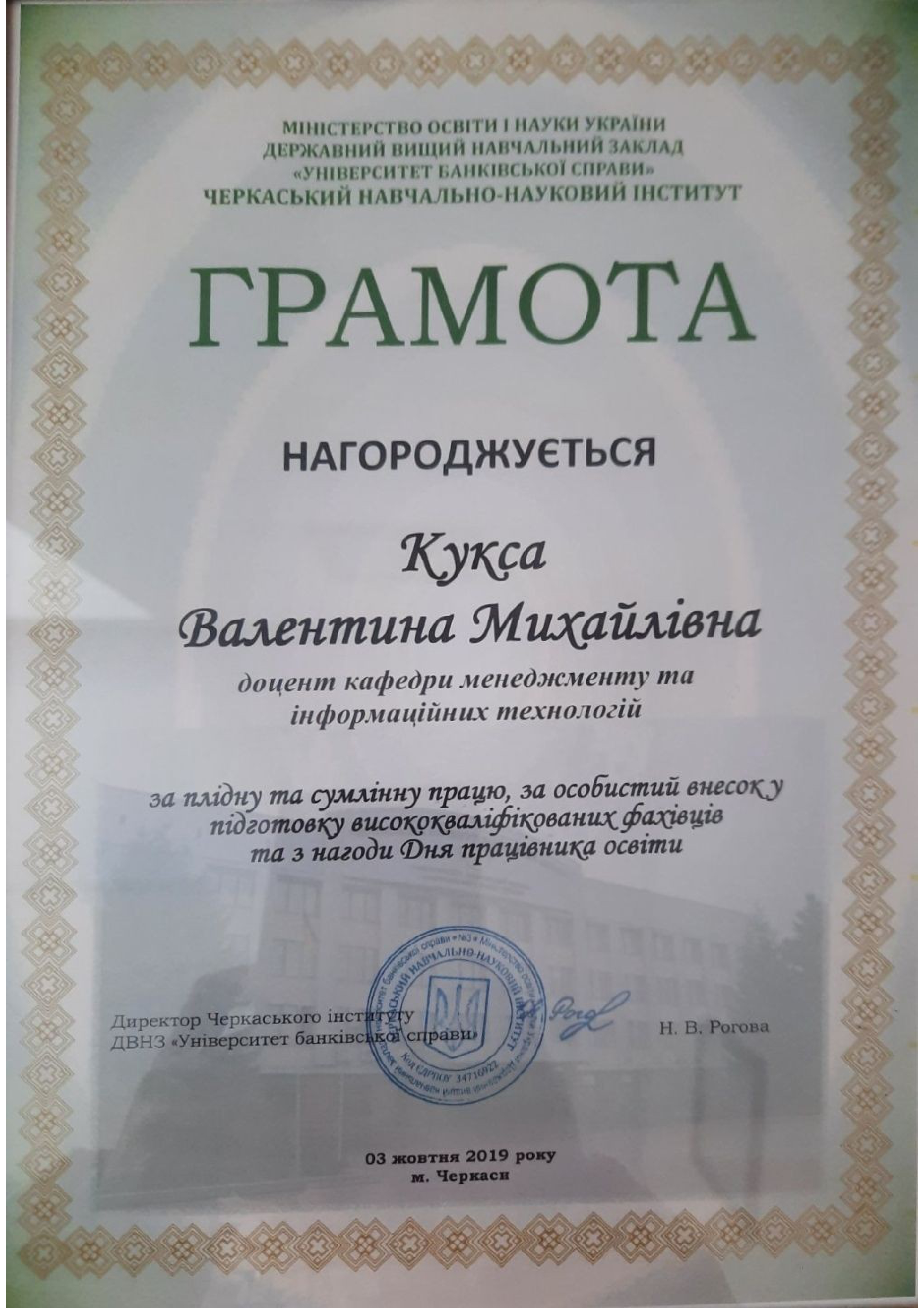 - Курс підвищення кваліфікації. "Вчителі 2.0: онлайн -курс із професійного розвитку та наставництва" 30 год. (1 кр. ECTS). Сертифікат №9f543569-15f2-4975-b8d4-6f1479628da7