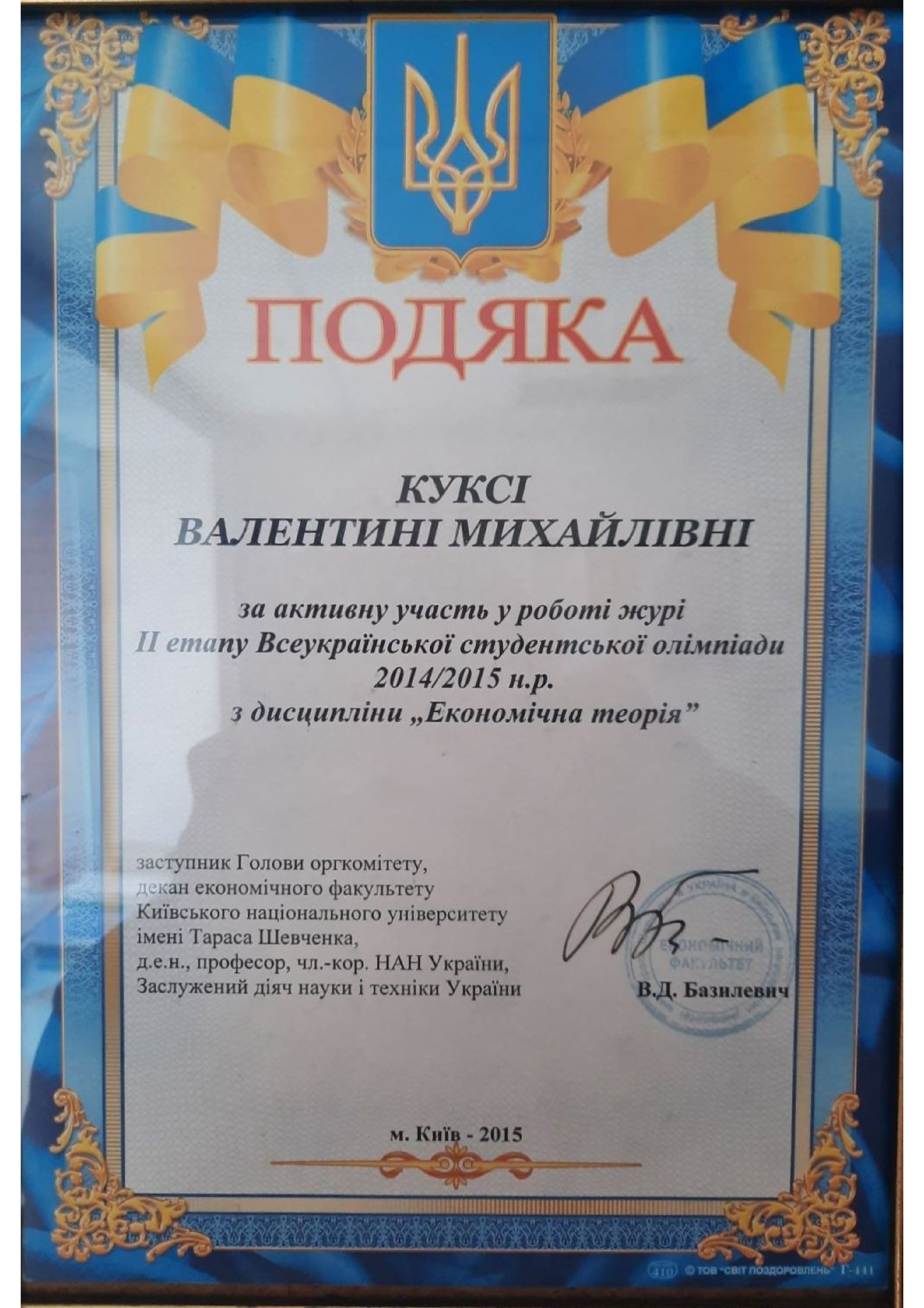 Спеціаліст, Диплом ЕР № 25653248 від 25.06.2004 р. Черкаський національний університет імені Богдана Хмельницького, спеціальність "Економічна теорія", кваліфікація - "Економіст, викладач-дослідник економічної теорії "